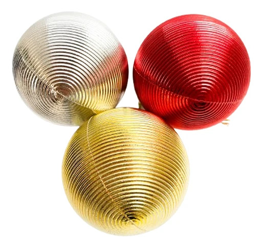 Introduce una textura única y un brillo intenso a tu decoración navideña con este atractivo set de esferas. Cada esfera presenta un distintivo patrón de rayas circulares concéntricas que simula un efecto hipnótico o espiral cuando refleja la luz. El pack incluye una esfera en cada uno de los colores metálicos más populares de la temporada: