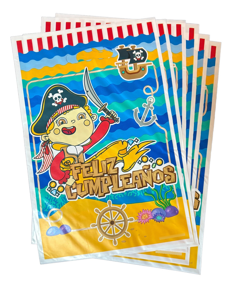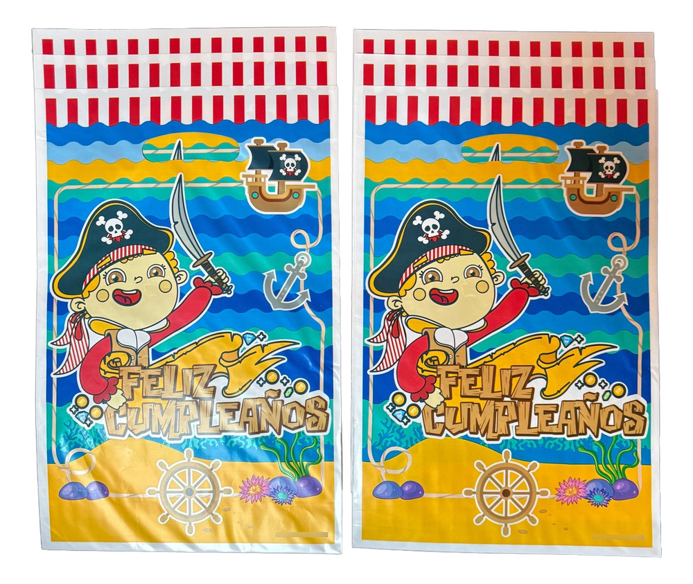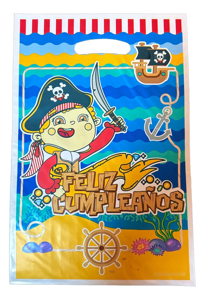 Diseñadas con colores vivos, un simpático personaje pirata y detalles marinos, estas bolsas son ideales para entregar dulces, regalitos o pequeños recuerdos de fiesta.