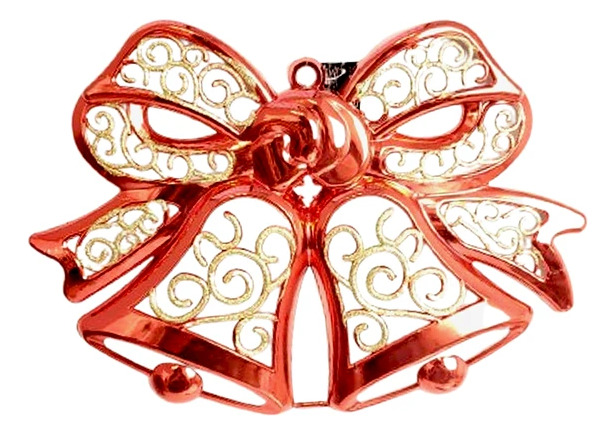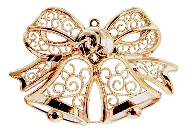 Añade un toque de sofisticación y brillo a tu decoración con este hermoso adorno. La figura presenta un diseño clásico de dos campanas navideñas entrelazadas, coronadas por un gran lazo (moño) decorativo. El adorno está elaborado con un diseño calado o filigrana con patrones de arabescos, y posee un lujoso acabado metálico en color dorado brillante.