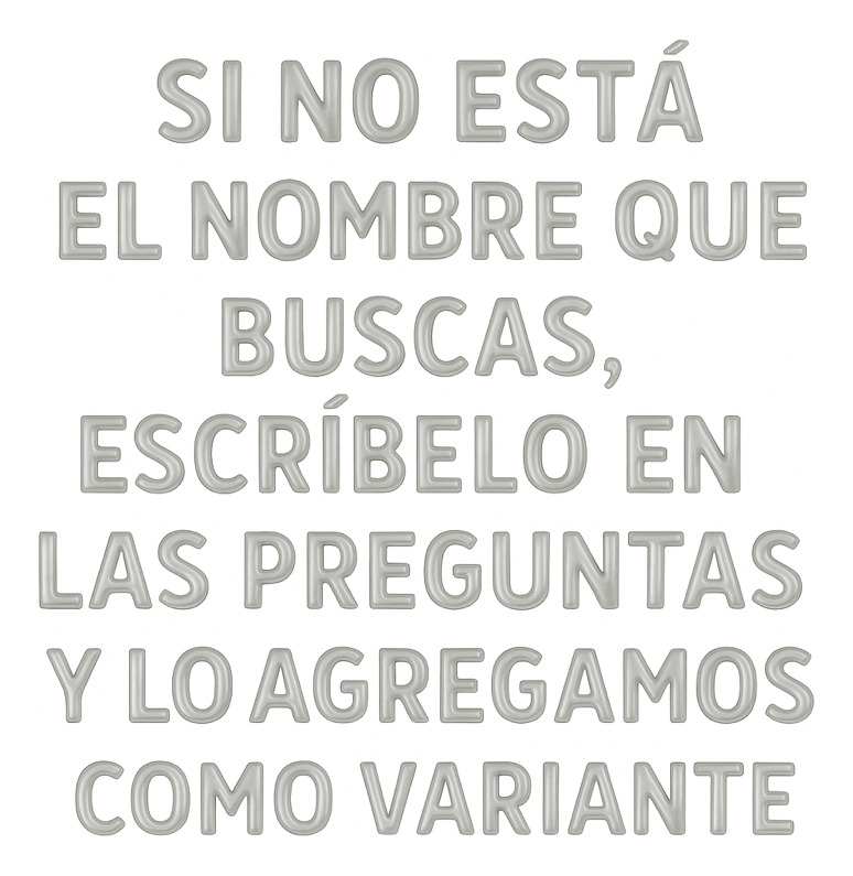 Déjalo en la caja de preguntas y lo agregamos de inmediato, sin costo adicional. (quedará agregado en la publicación que corresponda según la cantidad de letras que tiene el nombre que buscas; Si no corresponde a esta publicación, encuentra las otras publicaciones en nuestra página pulsando el botón «ir a la página del vendedor».