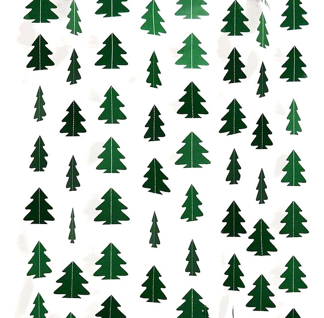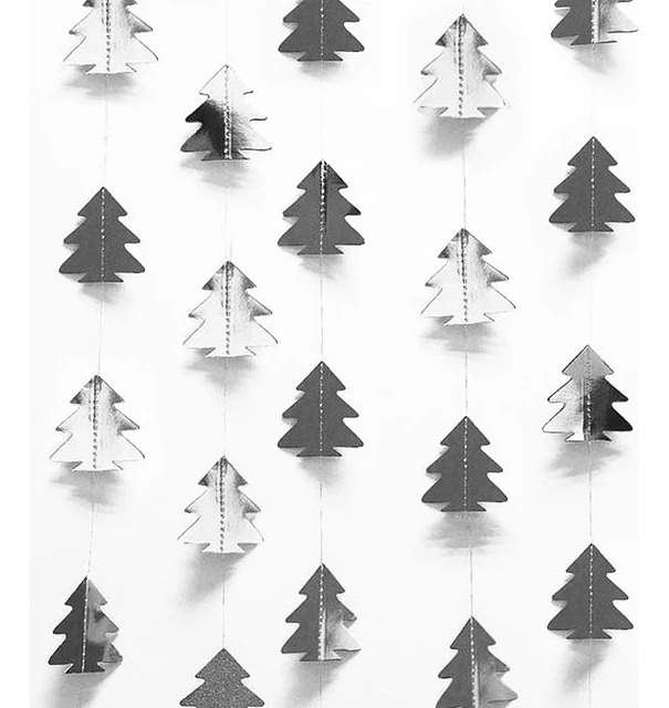 Crea un ambiente invernal y festivo con esta moderna guirnalda decorativa. La tira presenta una serie continua de figuras troqueladas con la forma de pequeños árboles de Navidad, unidas verticalmente por un hilo discreto. El material es de un llamativo color plateado metálico y brillante que refleja la luz, aportando un toque de elegancia y sofisticación.
