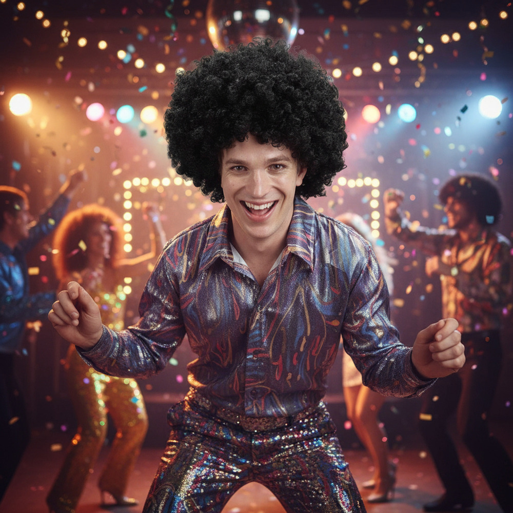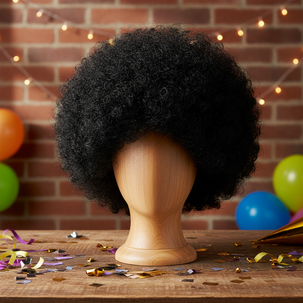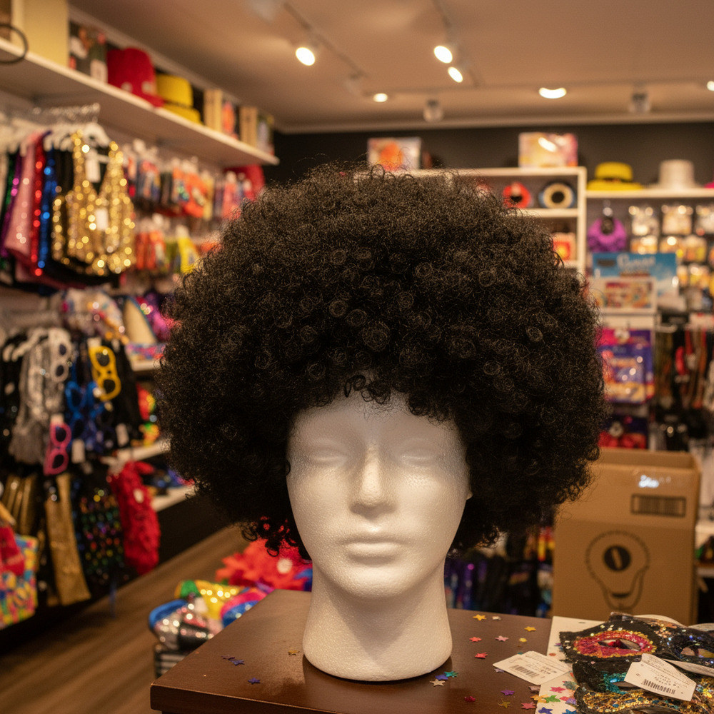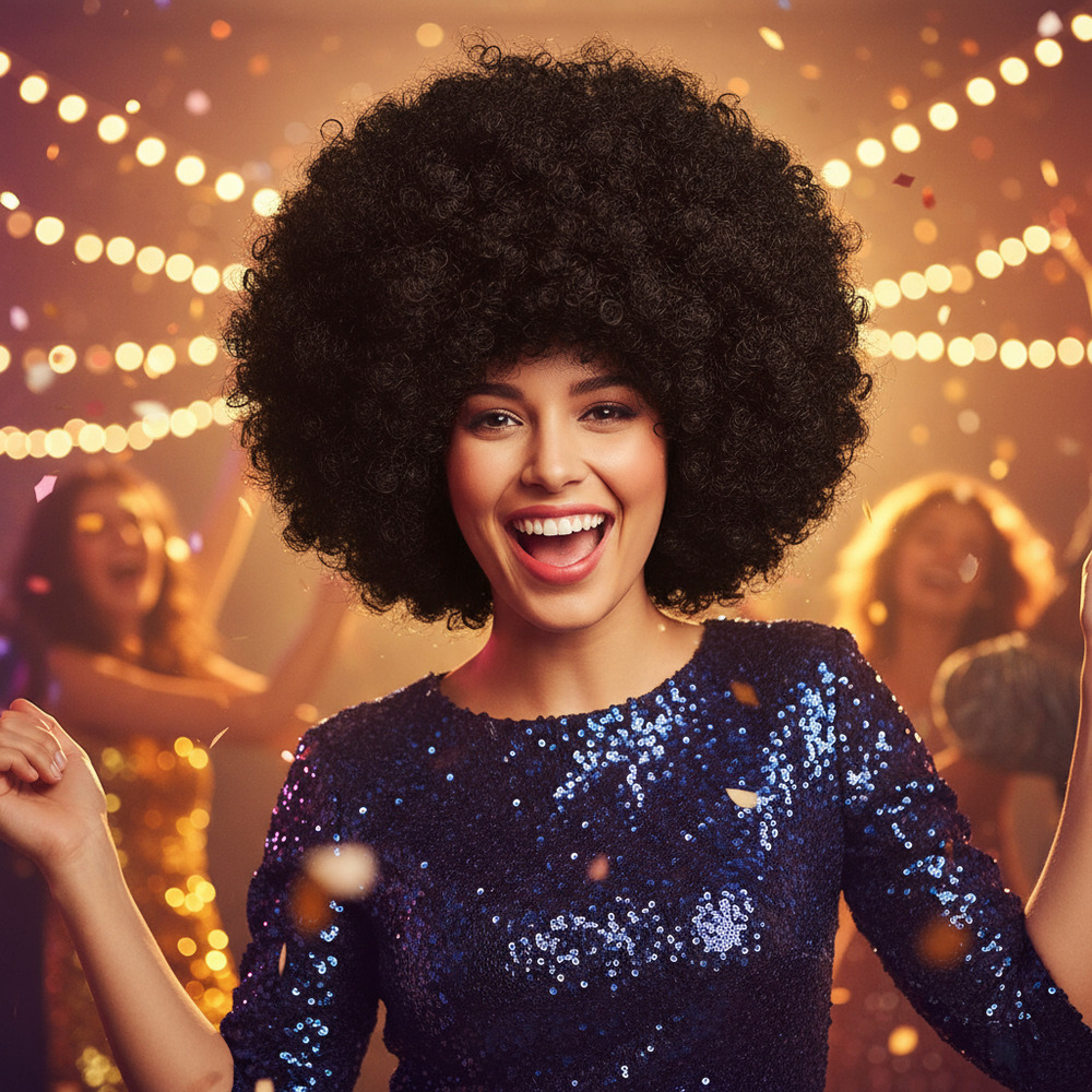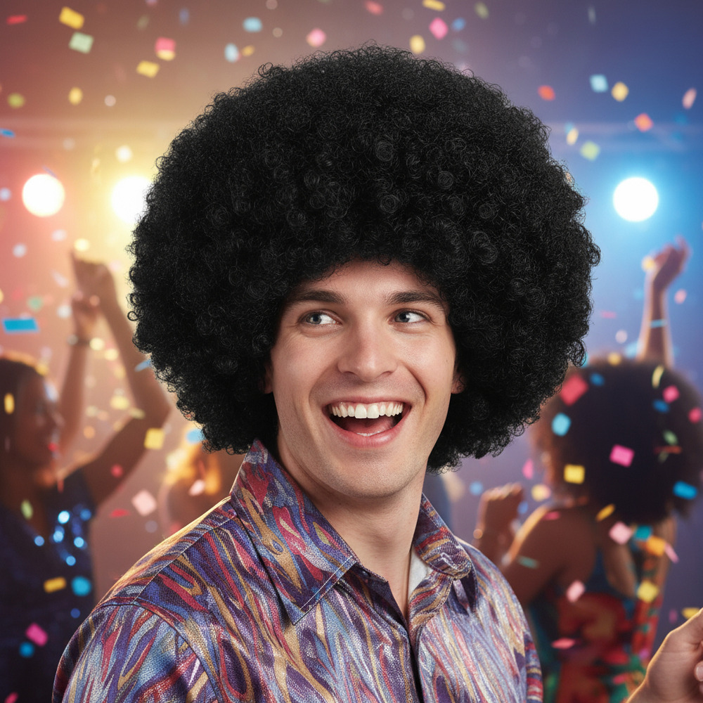 Dale un toque divertido y llamativo a tus fiestas con esta peluca afro de gran volumen. Ideal para fiestas temáticas, disfraces, shows, celebraciones de los años 70 u 80 y eventos donde quieras destacar. Su diseño frondoso imita el clásico estilo afro y viene acompañado de lentes retro para completar el look en segundos.